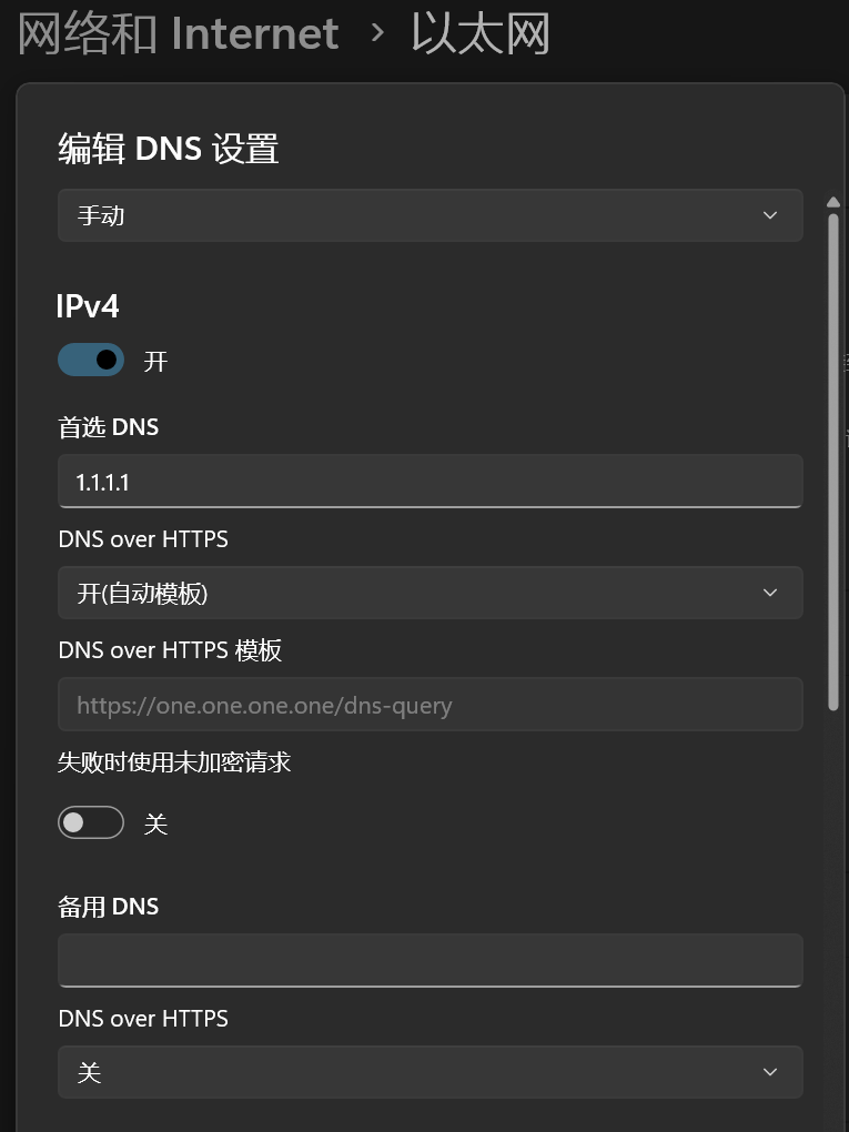 在Windows中设置中打开网路选项,并设置成加密的DNS手动配置:
