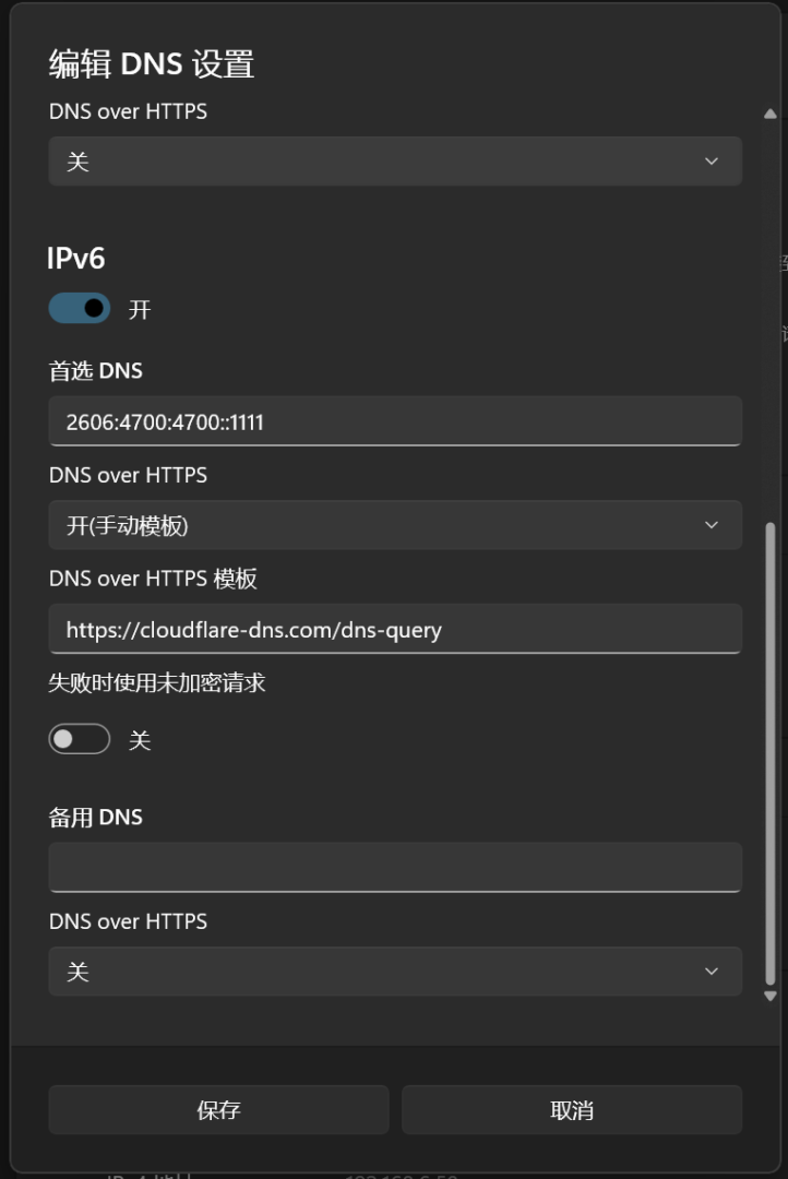 - 输入 https://cloudflare-dns.com/dns-query ,然后点击 保存。